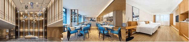 酒店大堂创新布局,集前台、商务、社交等多功能于一体,流畅的动线设计带来便捷高效的入住体验。酒店拥有150间精心设计的现代化客房,温暖的大地色系搭配精心调试的灯光与色调,营造出温暖舒适的氛围;充满复古气息的台灯与写意抽象的艺术画,凸显品牌的简约之美。客房均配备舒适床品、55寸液晶电视机、免费高速无线网络等便利设施,满足当代宾客的多元需求。