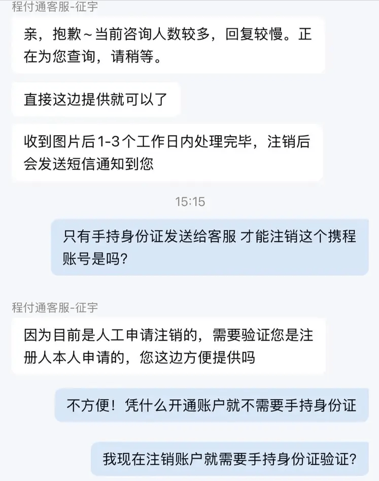 有人算了笔账:按携程要求,注销要过 “三关”——传身份证、录视频、清余额,光准备材料就得花 1 小时,客服审核再等 15 天,全程比办张银行卡还麻烦。可当初注册的时候,填个手机号收个验证码,30 秒就能搞定。“凭什么注册像逛超市,注销像闯海关?”