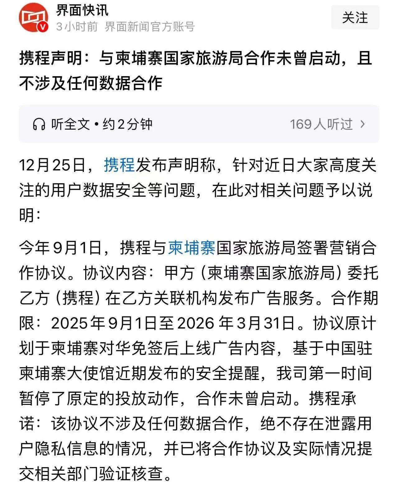 这场注销风波,早在 12 月 1 日就埋了伏笔。那天携程在上海高调宣布,要和柬埔寨国家旅游局搞合作,借着 2026 年柬埔寨对华免签的机会,推一批 “独家旅游产品”。消息一出来,网友们先慌了:“柬埔寨?就是那个天天上新闻的电诈重灾区?”