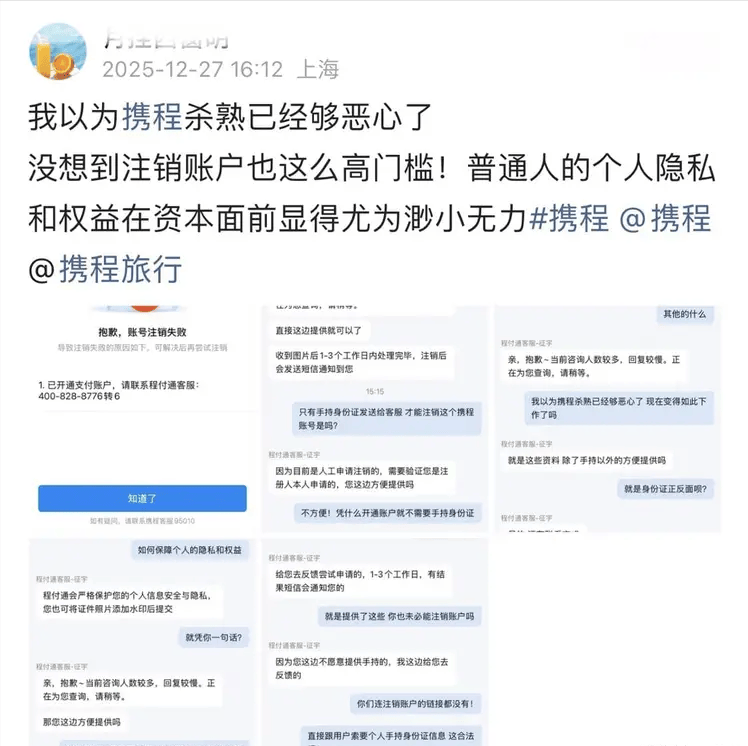12 月下旬,上海白领王女士的一条吐槽:“删个 APP 要我手持身份证录视频?这是注销账号还是给骗子递素材?”,在社交平台炸出了数十万同款遭遇的携程用户。