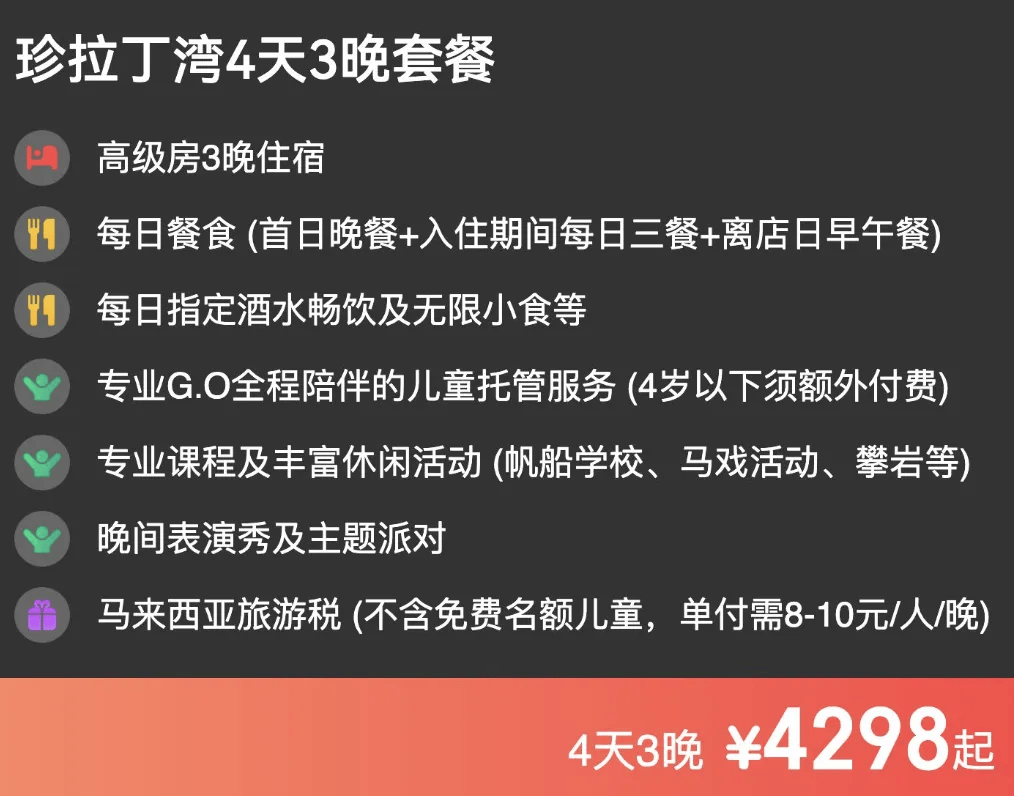 它属于大马之光——YTL杨忠礼酒店集团旗下酒店,套餐为一价全包,含每日早中晚三餐及快艇接送服务,另外还会赠送1晚吉隆坡或马六甲酒店住宿,相当于3 晚只需 6599 元,城市+海岛的完美搭配和极致体验,一定会给你带来回味悠长的度假记忆。