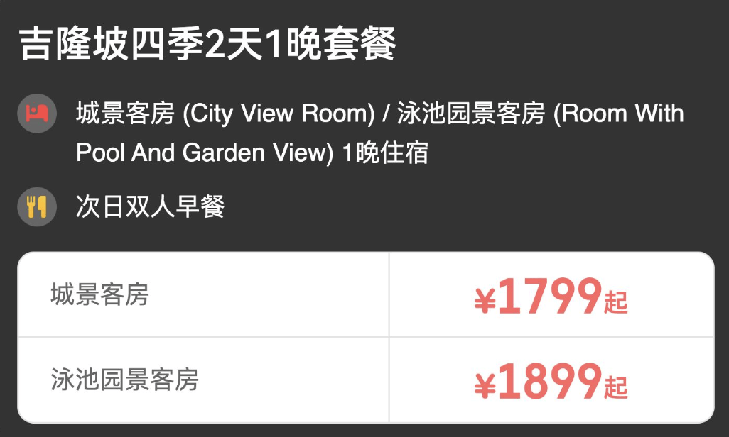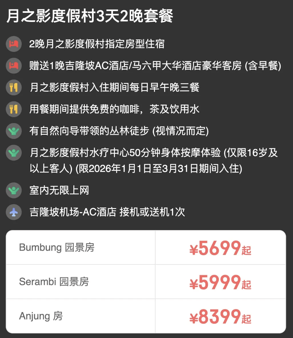 套餐同样为一价全包,也会赠送1晚吉隆坡或马六甲酒店住宿,平均单晚 1 开头,性价比非常高。