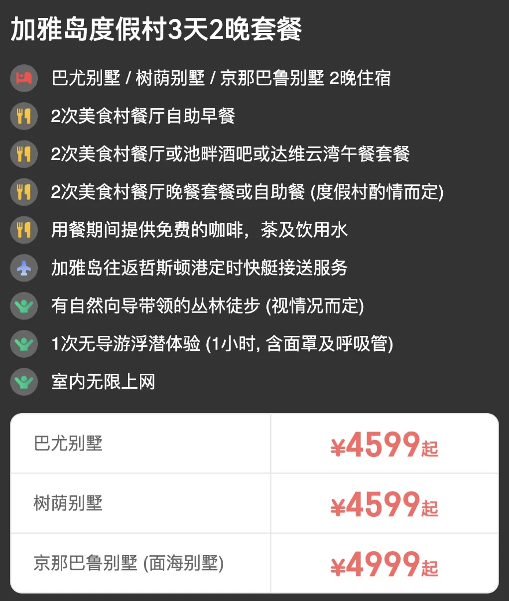 讲真,振拉丁湾的超高性价比套餐让我们很难说拒绝。平均单晚1433 元起可住1 大 1 小,而且还是一价全包。Club Med 每日一价,但珍拉丁湾度假村春节寒假价格十分友好,几乎就是淡季同价。