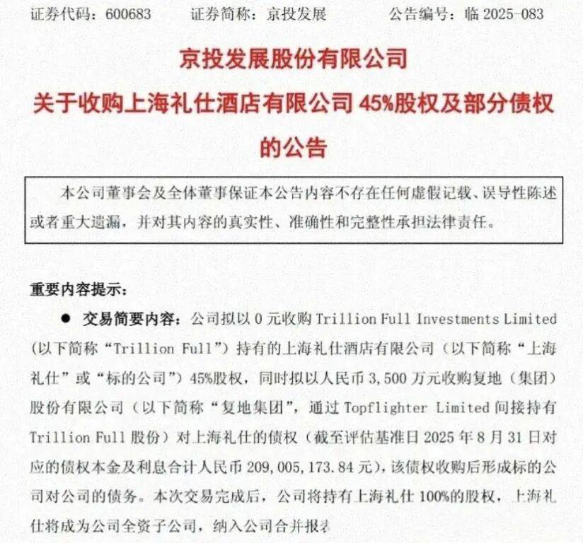 大约半个月前,北京国资旗下的京投发展一则公告显示,拟以0元收购Trillion Full Investments Limited持有的上海礼仕酒店有限公司45%股权,同时以3500万元收购复地集团对上海礼仕的一笔债权,该债权本息合计2.09亿元。
