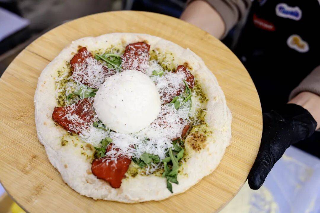 更令人称奇的是,传统与现代在此碰撞出创新的火花。本地知名餐吧Tiamo蒂阿茉将宁波“下饭神器”鄞州咸齑与意大利披萨结合,首创推出“咸齑披萨”,这种大胆的融合风味吸引了大量好奇的食客尝鲜。从“踩”出来的鄞州老味道,到“烤”出来的潮流新吃法,宁波美食的传承与创新活力在此展现得淋漓尽致,也让鄞州非遗文化以更鲜活的形式走进大众视野。