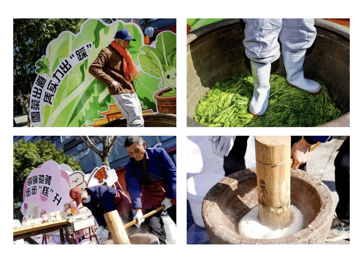 鄞州文旅复原了宁波非遗“踩咸齑”(腌制咸菜)和古法打年糕的场景,邀请市民亲身参与。脚踩盐坛的“硬核”腌制技艺,与捶打米团的汗水与米香,让深藏于鄞州民俗中的“年味”变得可触摸、可体验,唤醒了许多人的童年记忆。
