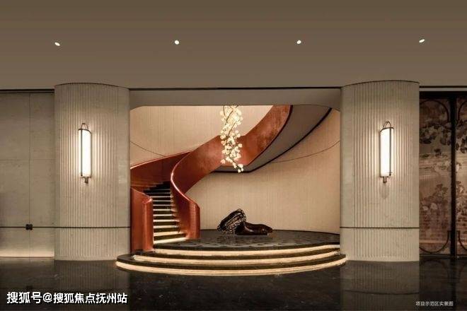 ① 繁花之梯,同频百年华尔道夫,以精工细节打造海派艺术空间,一抹红色艺术楼梯是会所中的点金之笔,其形态宛若一缕红飘带,点缀于会所当中。