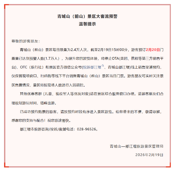 景区已停止OTA(美团、携程等)、OTC(旅行社)及官方微信公众号“悦游都江堰”“青城山都江堰”线上销售渠道预约,仅保留现场窗口、扫码购等线下平台销售当日门票。景区将根据现场人数进行入园调控,请游客实时关注。