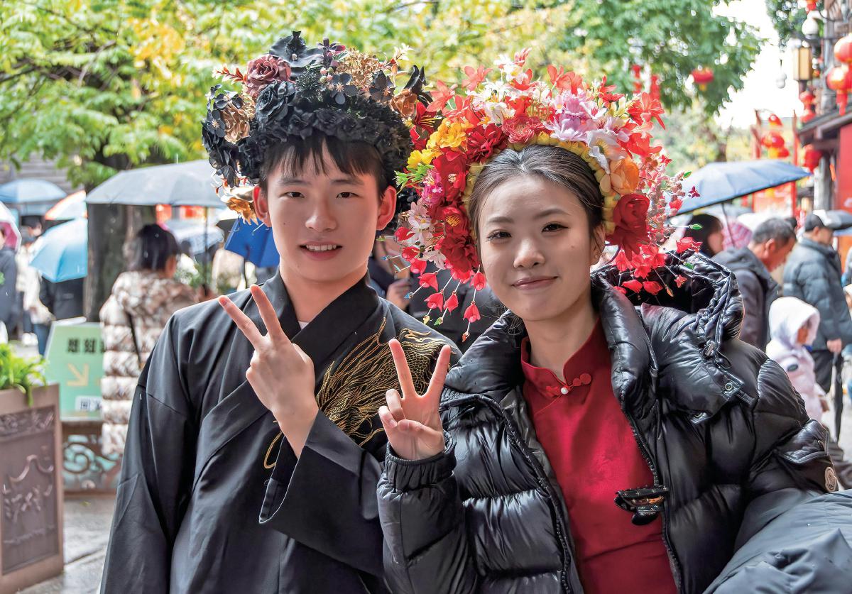2月3日,在福建省福州市千年古街三坊七巷,两名来自上海的游客头戴“簪花”打卡留影。新华社记者魏培全摄